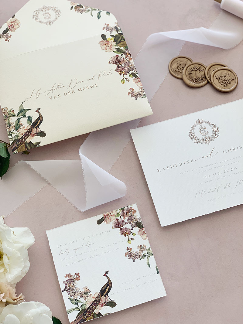 – Matching envelope printed on cream fine art paper with floral detailing and adorned with a gold wax seal