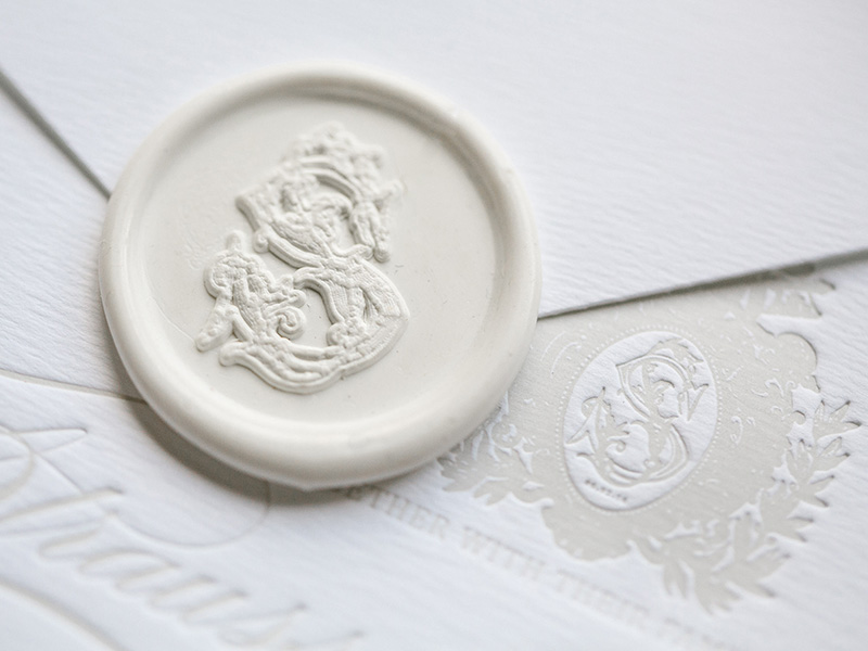 She opted for breathtakingly beautiful old worldly classic white letterpress printed invitations on white textured cotton paper. Coupled with a matching envelope and envelope liner, and finished off with a white monogrammed wax seal.
