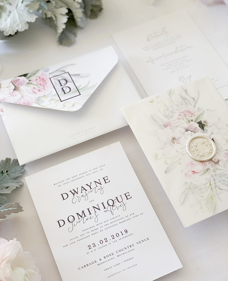 Vellum folder invitation adorned with a gold wax seal, which comes with two printed inner cards and a matching floral printed envelope which is addressed with guest names on the front and has your monogram printed on the back flap.